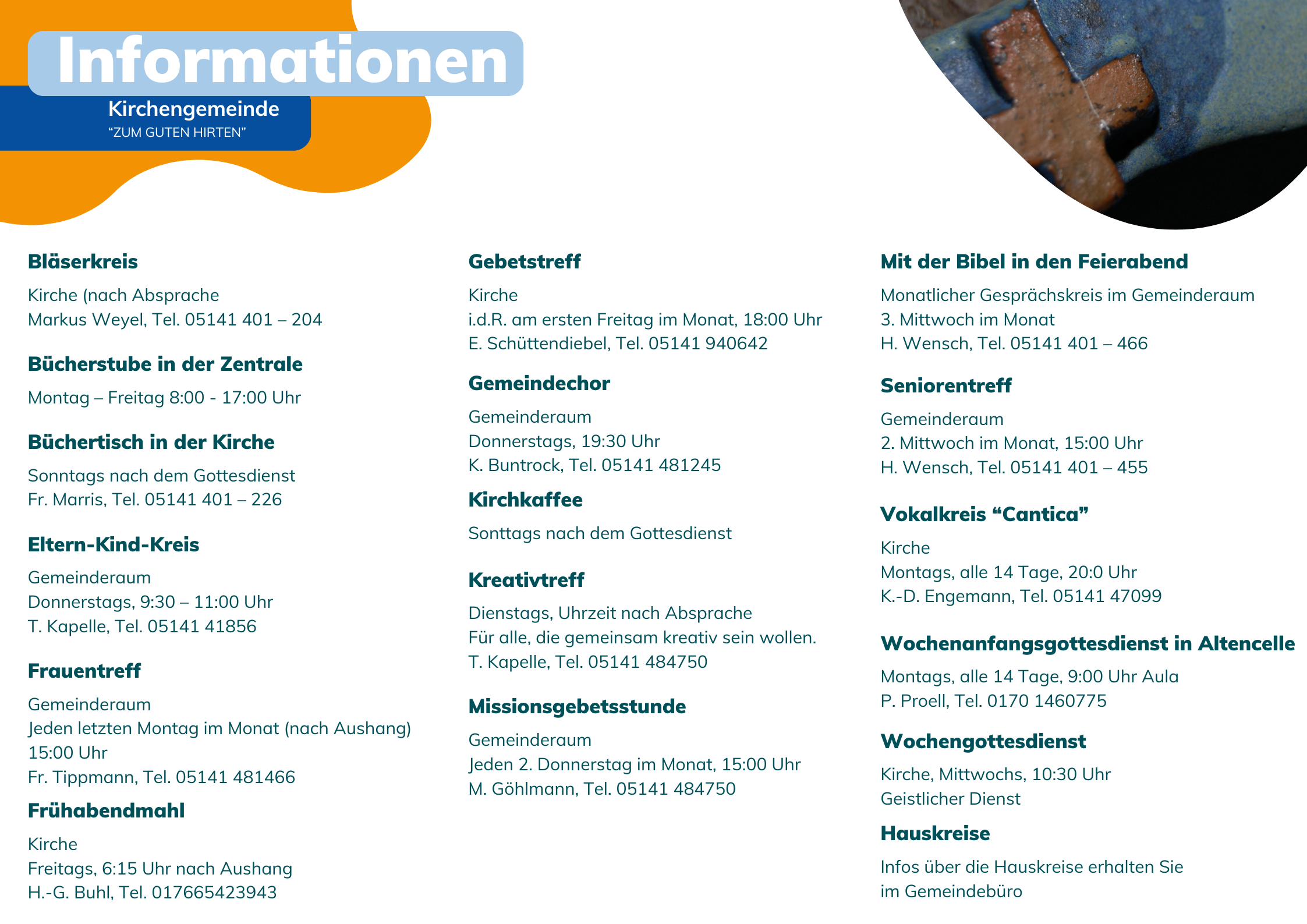 | Mittwochs | 10:30 Uhr | Wochengottesdienst Celle |